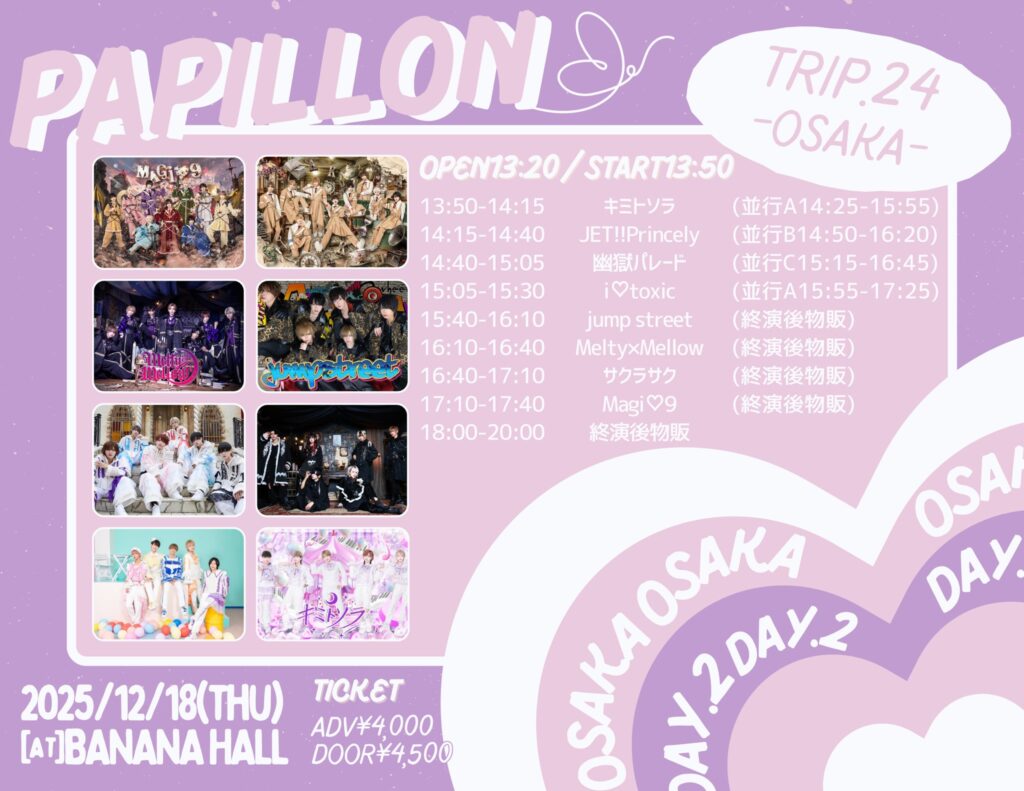 | 14 撮影会🎄🎁🎅🌟 2025/12/14 ~ 2025/12/14 撮影会🎄🎁🎅🌟![]() ![]() 会場:渋谷区千駄ヶ谷3-16-3 OPEN15:00/START15:30 1部15:30-17:00 2部17:30-19:00 3部19:30-21:00 | 15 | 16 | 17 🚄🐙大阪遠征🐙🚄 2025/12/17 ~ 2025/12/18 🚄🐙大阪遠征🐙🚄![]() 12/17 Papillon🦋@BananaHall OPEN15:00/START15:30 ライブ時間:18:30-19:10 特典会時間:19:30-21:30 ![]() 12/18 Papillon🦋@BananaHall OPEN13:20/START13:50 ライブ時間:16:10-16:40 特典会時間:18:00-20:00 | 18 🚄🐙大阪遠征🐙🚄 2025/12/17 ~ 2025/12/18 🚄🐙大阪遠征🐙🚄![]() 12/17 Papillon🦋@BananaHall OPEN15:00/START15:30 ライブ時間:18:30-19:10 特典会時間:19:30-21:30 ![]() 12/18 Papillon🦋@BananaHall OPEN13:20/START13:50 ライブ時間:16:10-16:40 特典会時間:18:00-20:00 | 19 | 20 GOOD FLELD 2025/12/20 ~ 2025/12/20 GOOD FLELD![]() ![]() 会場:代々木公園野外ステージ OPEN10:30/START10:45 ライブ時間:14:30-14:55 特典会時間:15:00-16:40 |